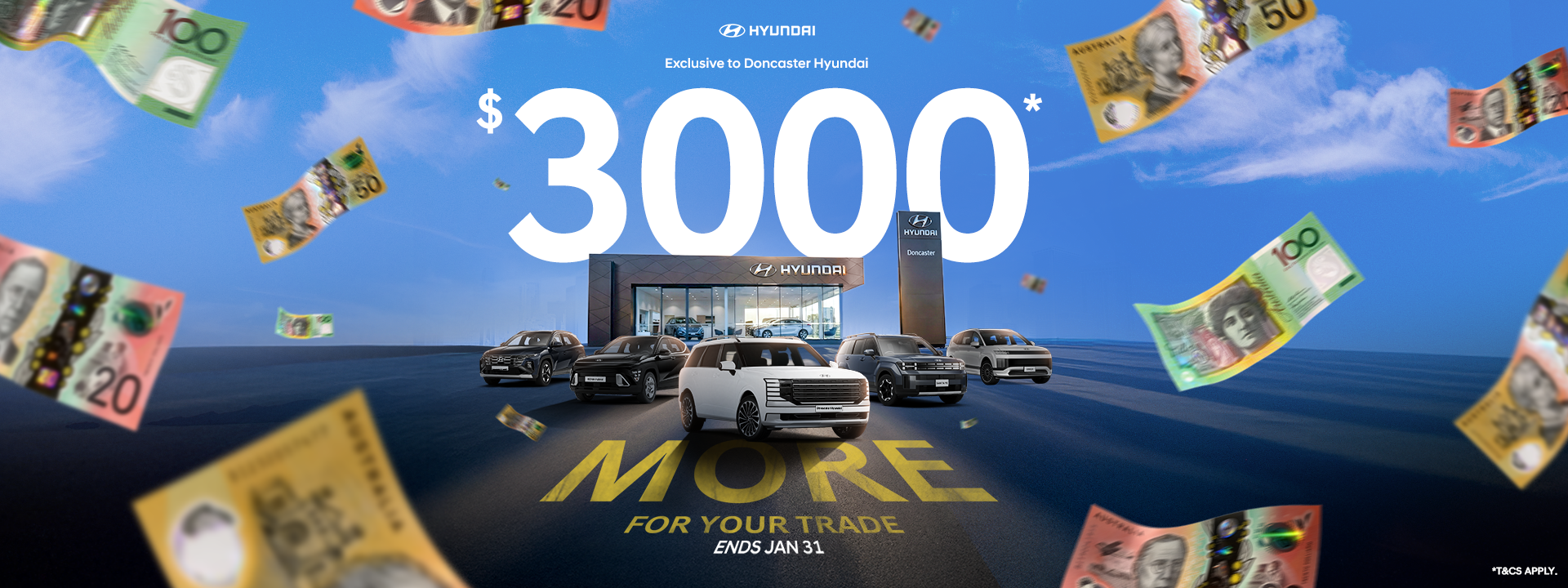 *Terms and conditions: the $3,000 trade-in bonus is available on vehicles traded in at Doncaster Hyundai between January 1st 2026 and January 31st 2026, only. The $3,000 trade-in bonus is paid in addition to the dealership’s assessed trade-in value. All trade-in valuations must be conducted by Doncaster Hyundai. Valuations obtained from third parties, online platforms or other dealerships will not be accepted or matched. The trade-in value and bonus are based on a true and correct valuation at the time of appraisal and are valid for seven days only, unless otherwise stated in writing by the dealership. The traded vehicle must be in roadworthy condition, currently registered and must not be a repairable write-off or statutory write-off. The trade-in bonus must be mentioned at the time of enquiry and prior to the trade-in price being agreed upon. The offer is not valid once a trade-in value has already been finalised. Delivery of the new vehicle must take place during January 2026 unless otherwise approved in writing by the dealership. Doncaster Hyundai reserve the right to refuse a trade-in or withdraw the offer at their discretion. The dealership is under no obligation to make an offer or to purchase any vehicle. This offer is not redeemable for cash, is not transferable and cannot be used in conjunction with any other trade-in bonus or promotional offer unless stated otherwise. Enquire within dealership for full details. Doncaster Hyundai reserves the right to modify, cancel or extend the offer at any time.