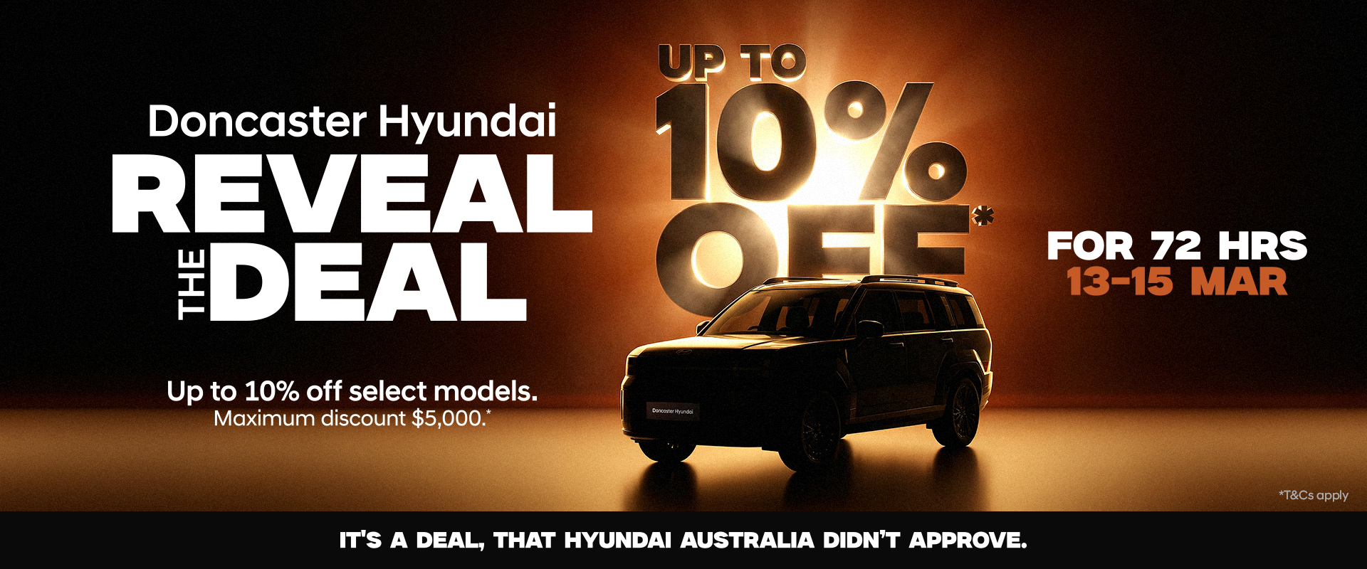 *Terms and conditions apply; offer available on selected in-stock vehicles at Doncaster Hyundai only. Discount calculated from the manufacturer’s recommended retail price (RRP). Maximum discount of $5,000 applies. Excludes government charges. Offer valid for 72 hours unless extended or withdrawn earlier. Vehicle must be purchased between 13 March 2026 and 15 March 2026 and delivered by 31 March 2026. Doncaster Hyundai reserves the right to modify, extend or cancel the offer at any time. Not in conjunction with any other offer. LMCT444.
